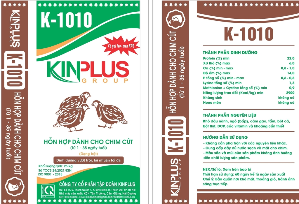 Sản phẩm K-1010: HH dành cho cút từ 01 đến 35 ngày tuổi loại là sản phẩm cung cấp đầy đủ dưỡng chất cho chim. Đặc biệt K 1010 được bổ sung Cà gai leo giải độc gan cho lá gan khỏe và Men KPG được bổ sung giúp hệ thống tiêu hóa ổn định cho một hệ thống tiêu hóa khỏe và hấp thu được hết các dưỡng chất trong cám K 1010 giảm chi phí cho người chăn nuôi.