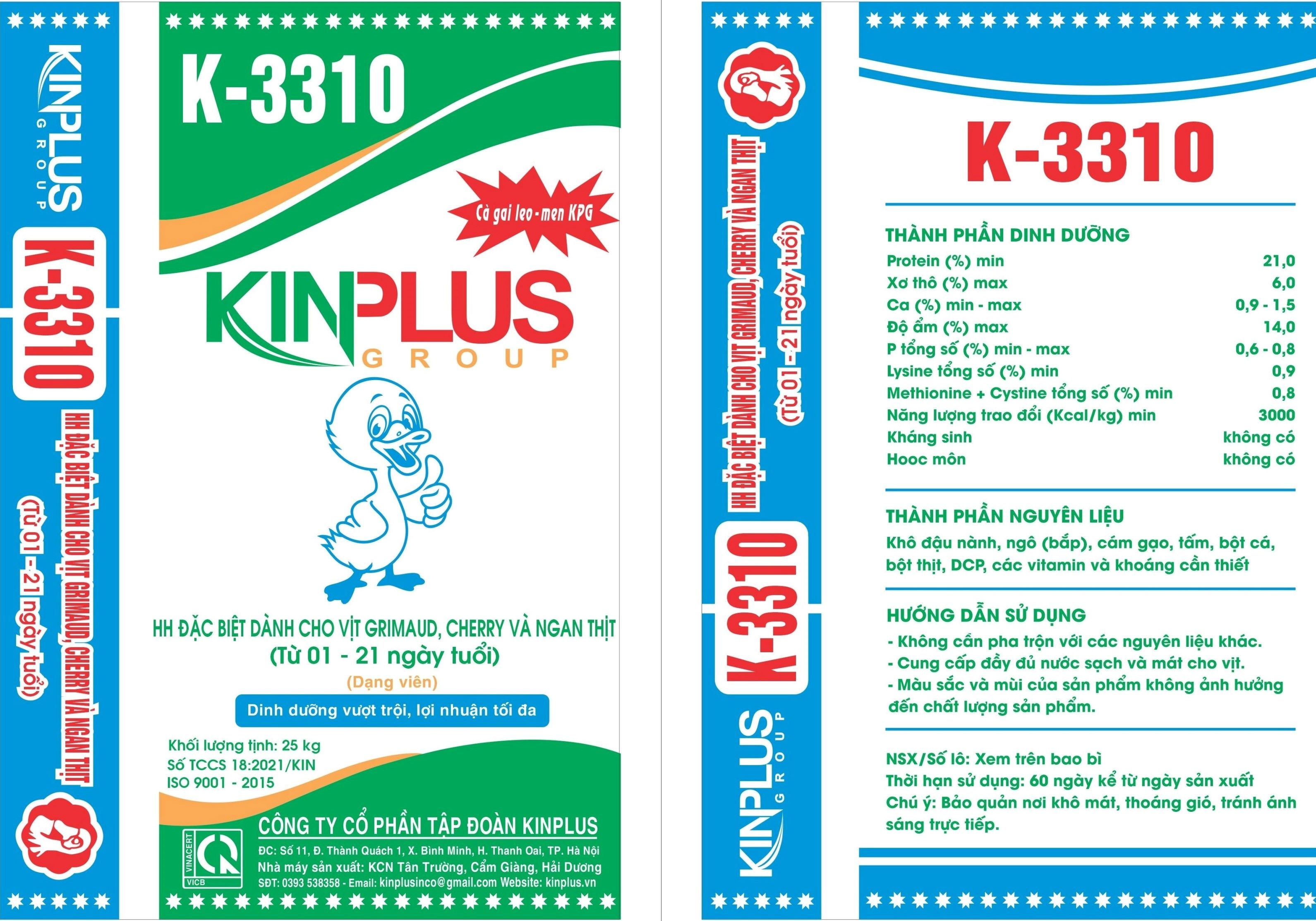 Sản phẩm K-3310: HH đặc biệt dành cho vịt Grimaud, Cherry và ngan thịt từ 1 ngày đến 21 ngày tuổi là sản phẩm cung cấp đầy đủ dưỡng chất cho vịt , ngan sự khởi đầu khỏe mạnh và giữ được đầu con. Đặc biệt K 3310 được bổ sung Cà gai leo giải độc gan cho lá gan khỏe và Men KPG được bổ sung giúp hệ thống tiêu hóa ổn định cho một hệ thống tiêu hóa khỏe và hấp thu được hết các dưỡng chất trong cám K 3310 giảm chi phí cho người chăn nuôi.
