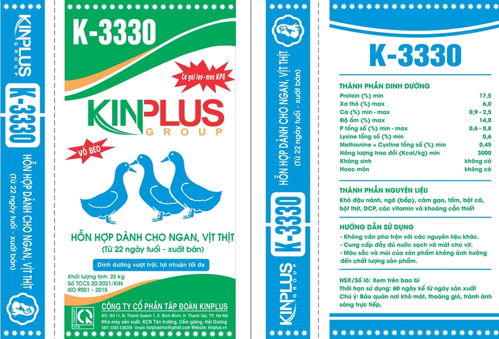 Sản phẩm K-3330: HH đặc biệt dành cho ngan, vịt thịt từ 22 - Xuất bán là sản phẩm cung cấp đầy đủ dưỡng chất cho vịt , ngan sự khởi đầu khỏe mạnh và giữ được đầu con. Đặc biệt K 3330 được bổ sung Cà gai leo giải độc gan cho lá gan khỏe và Men KPG được bổ sung giúp hệ thống tiêu hóa ổn định cho một hệ thống tiêu hóa khỏe và hấp thu được hết các dưỡng chất trong cám K 3330 giảm chi phí cho người chăn nuôi.