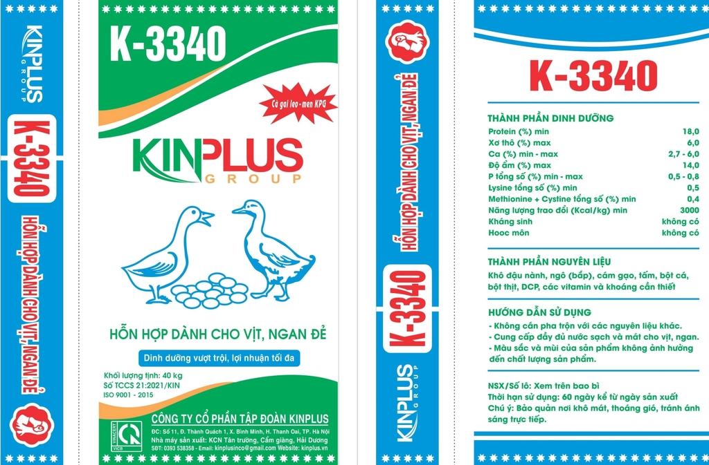 Sản phẩm K-3340: HH đặc biệt dành cho vịt, ngan đẻ là sản phẩm cung cấp đầy đủ dưỡng chất cho vịt giúp vịt đẻ sai và bền mái. Đặc biệt K 3340 được bổ sung Cà gai leo giải độc gan cho lá gan khỏe và Men KPG được bổ sung giúp hệ thống tiêu hóa ổn định cho một hệ thống tiêu hóa khỏe và hấp thu được hết các dưỡng chất trong cám K 3340 giảm chi phí cho người chăn nuôi.