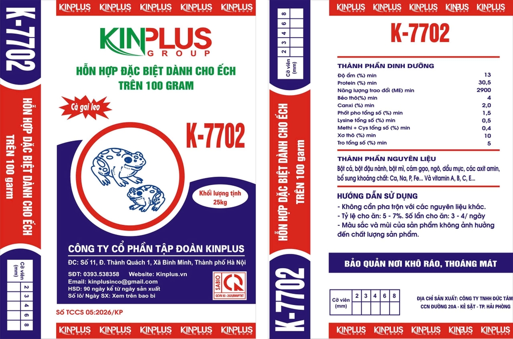 K7702: HH đặc biệt dành cho ếch trên 100 gram. Đặc biệt sản phẩm được bổ sung Cà gai leo giải độc gan cho lá gan và mang khỏe và Men KPG được bổ sung giúp hệ thống tiêu hóa ổn định cho một hệ thống tiêu hóa khỏe và hấp thu được hết các dưỡng chất trong cám giảm chi phí cho người chăn nuôi. Ếch khỏe, đùi to và săn chắc.