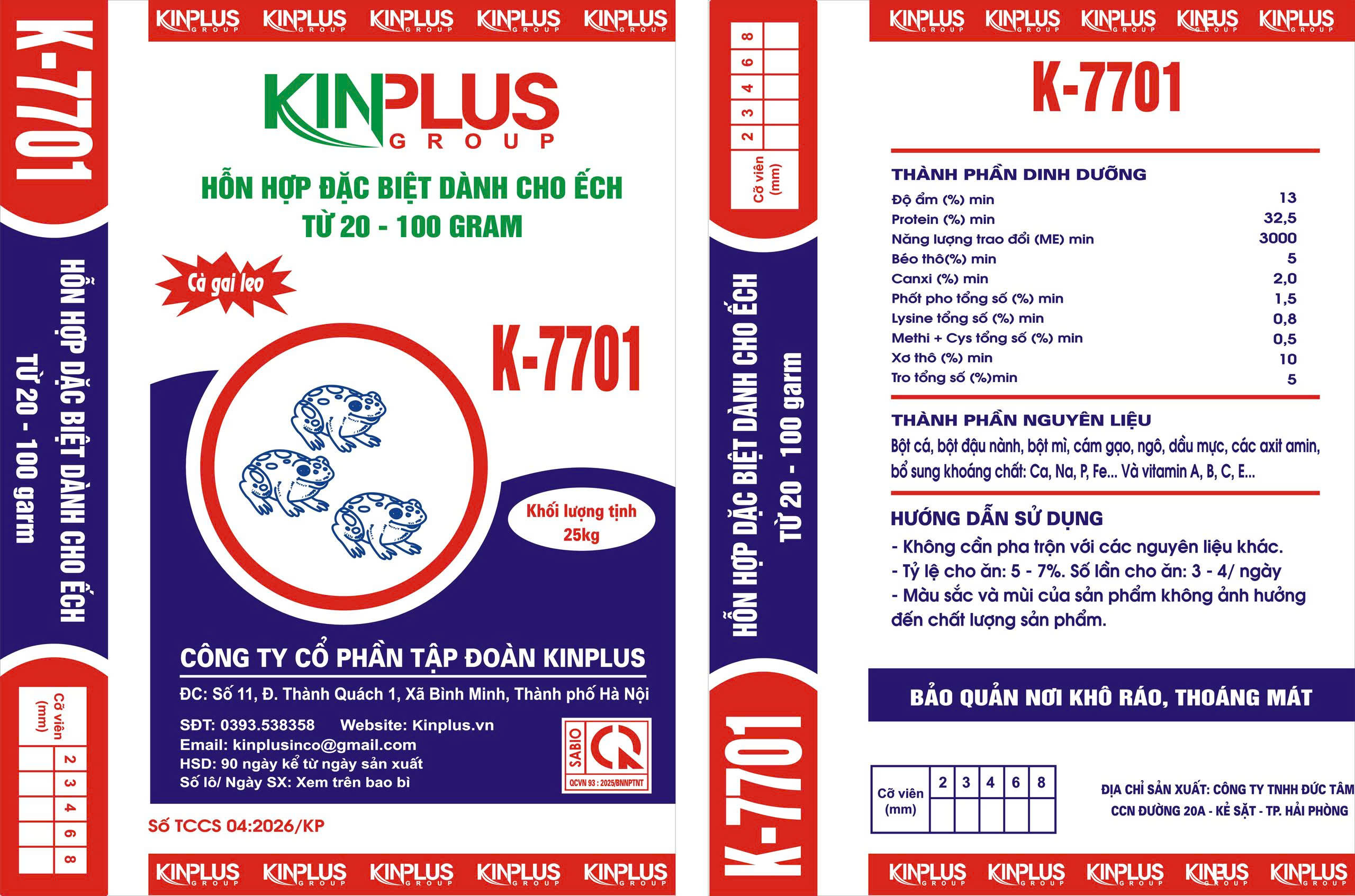 K7701: HH đặc biệt dành cho ếch từ 20 đến 100 gram. Đặc biệt sản phẩm được bổ sung Cà gai leo giải độc gan cho lá gan và mang khỏe và Men KPG được bổ sung giúp hệ thống tiêu hóa ổn định cho một hệ thống tiêu hóa khỏe và hấp thu được hết các dưỡng chất trong cám giảm chi phí cho người chăn nuôi. Ếch khỏe, đùi to và săn chắc. Tăng tỷ lệ sống.