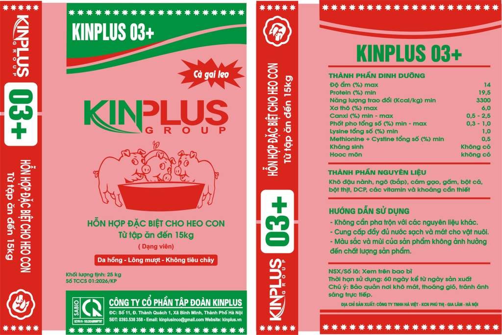 Sản phẩm Kinplus 03+ Bao Hồng: Hỗn hợp đặc biệt cho heo từ tập ăn đến 15 kg.